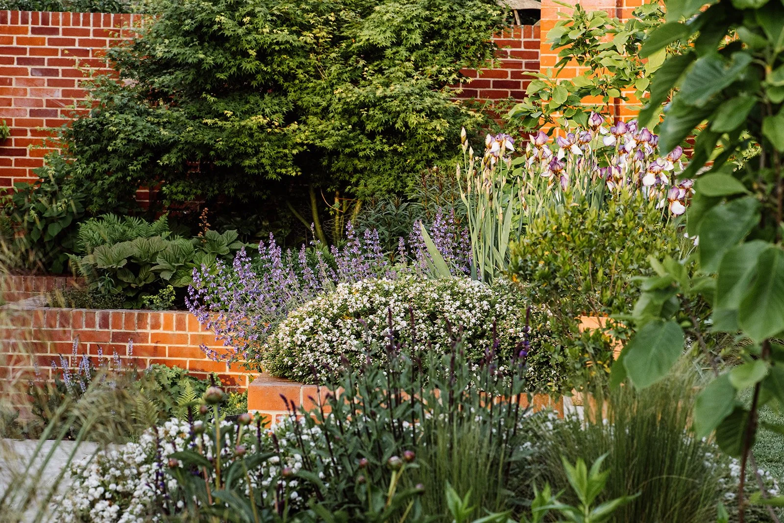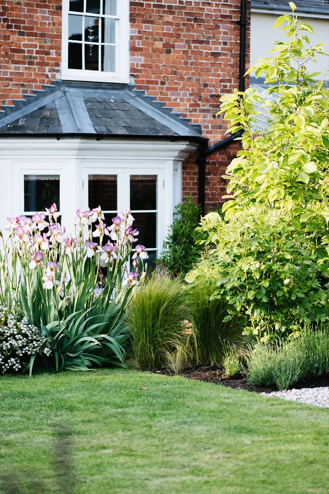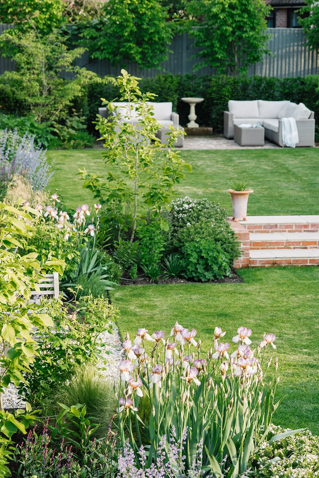 Up the wide and easy steps to the first lawn there is a seating area offering a place to relax in the afternoon sunshine and get a hint of the myrrh scented The Generous Gardener climbing rose as it wafts across the garden towards the renovated summer house. Here four Magnolia Elizabeth trees, planted the year of Elizabeth II’s death, with their unusual large pale yellow flowers are planted on each corner with Lavenders, Salvias, Achillea, Nepeta, Calamintha and Geranium amongst many others that pull together the yellow, blue and purple planting palette. The month of May is dominated by the showy blooms of Iris Benton Lorna with its stunning two tone flowers.