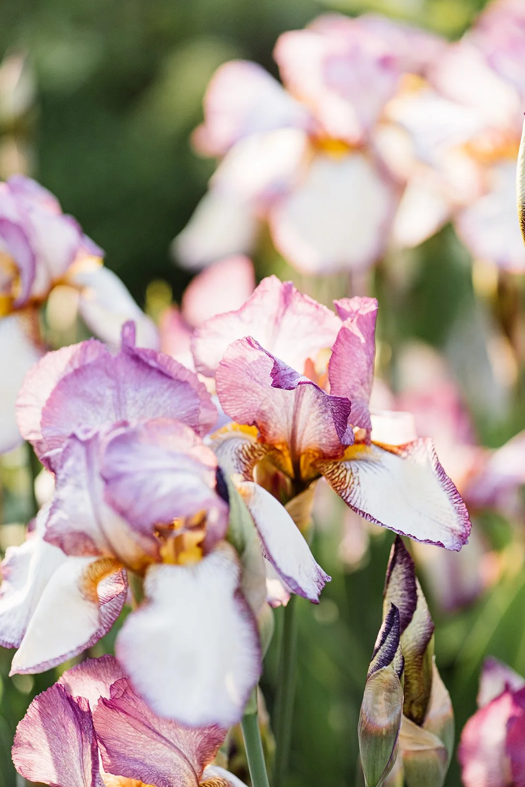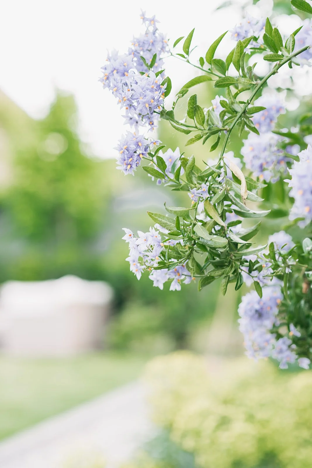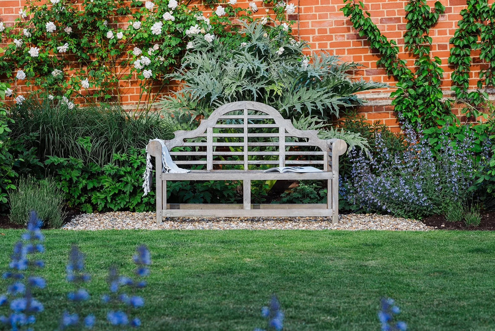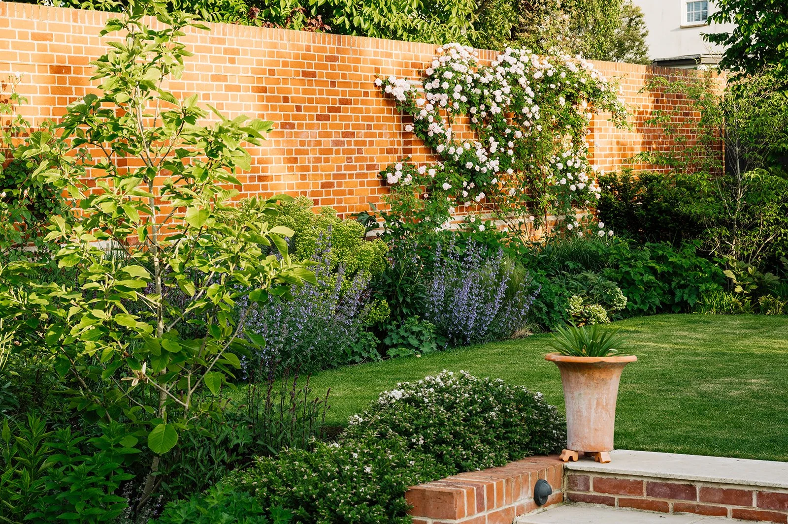 Up the wide and easy steps to the first lawn there is a seating area offering a place to relax in the afternoon sunshine and get a hint of the myrrh scented The Generous Gardener climbing rose as it wafts across the garden towards the renovated summer house. Here four Magnolia Elizabeth trees, planted the year of Elizabeth II’s death, with their unusual large pale yellow flowers are planted on each corner with Lavenders, Salvias, Achillea, Nepeta, Calamintha and Geranium amongst many others that pull together the yellow, blue and purple planting palette. The month of May is dominated by the showy blooms of Iris Benton Lorna with its stunning two tone flowers.