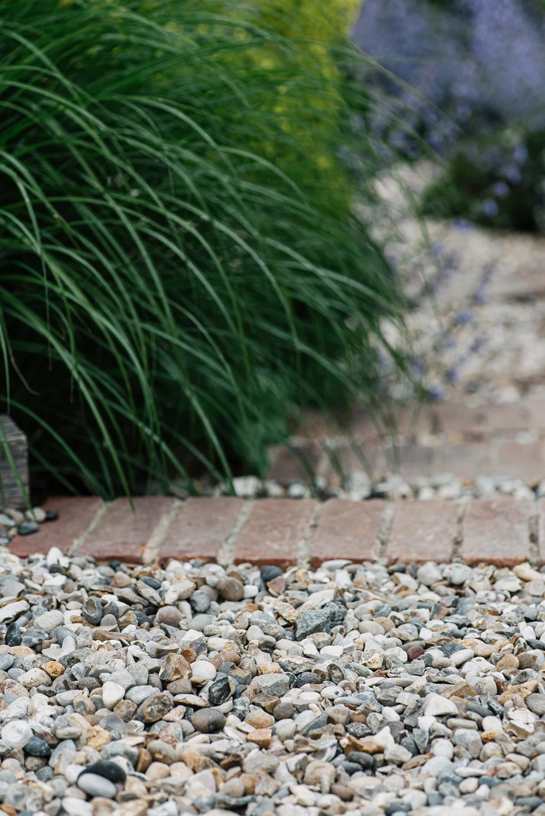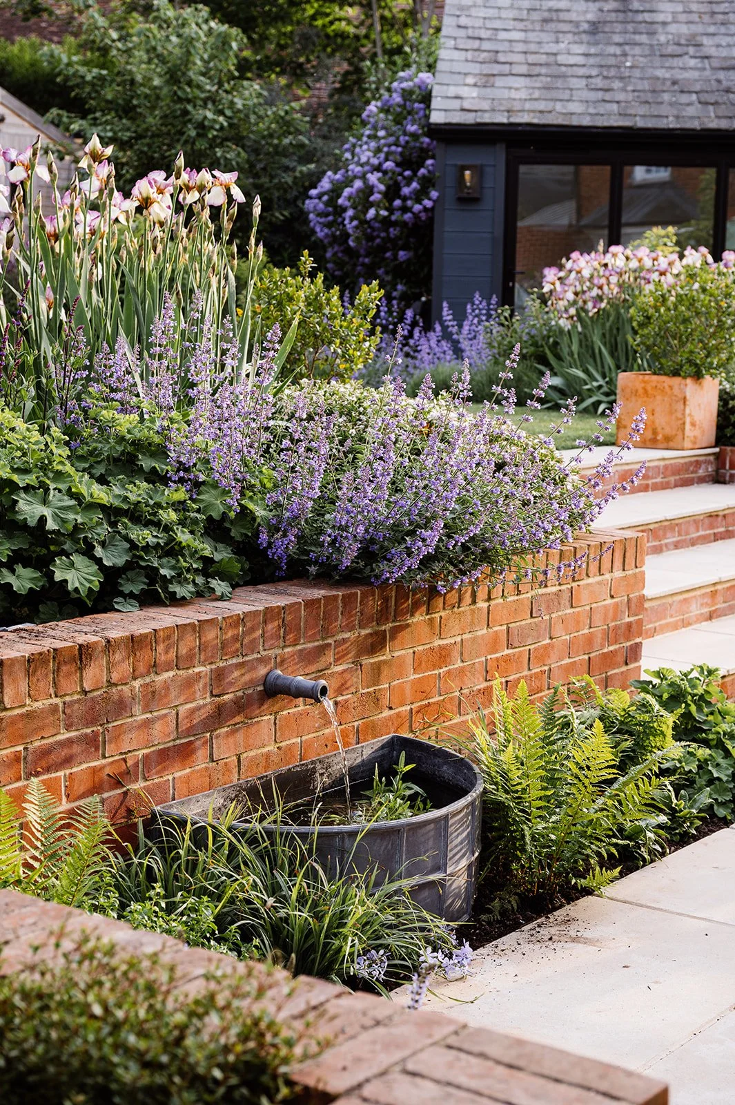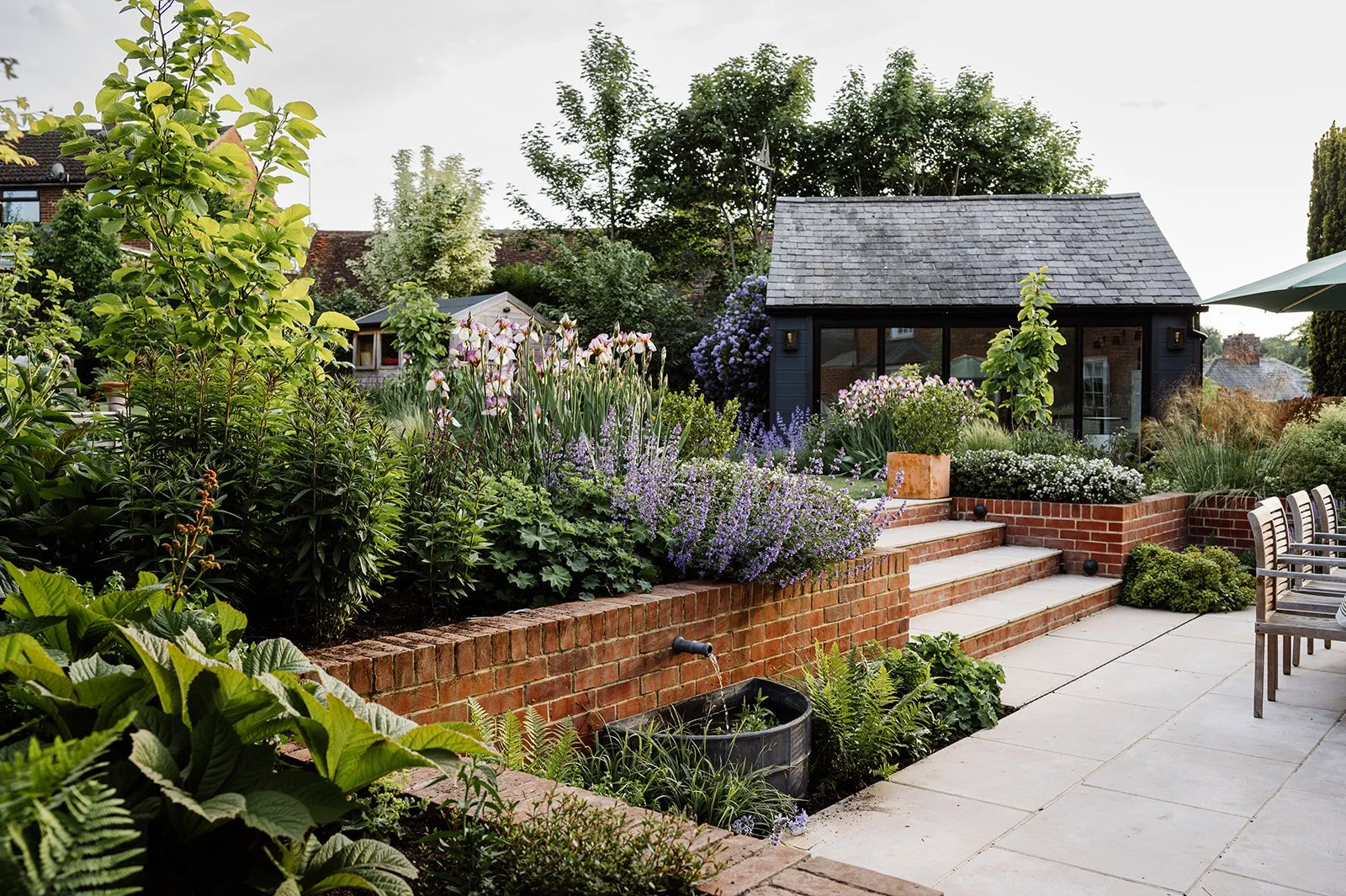 The lower dining terrace and steps are made from large format Limestone with warm buff tones and encircled by soft textural planting to include Salvias, Lavender, curry plant and catmints that release gorgeous scents when brushed past. The South facing lower terrace is a real sun trap, so the gentle running water of a small feature, brings a sense of cool and sits at ground level opposite the rear doors so it can also be viewed and enjoyed from inside.