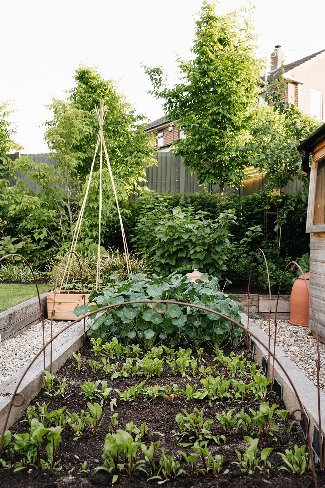 Tucked to the right hand side is a bijou vegetable garden with raised beds and a small border for fruit bushes and trees next to the much loved Man Cave. A gravel path leads you back down past the summer house to the lower terrace and car parking.