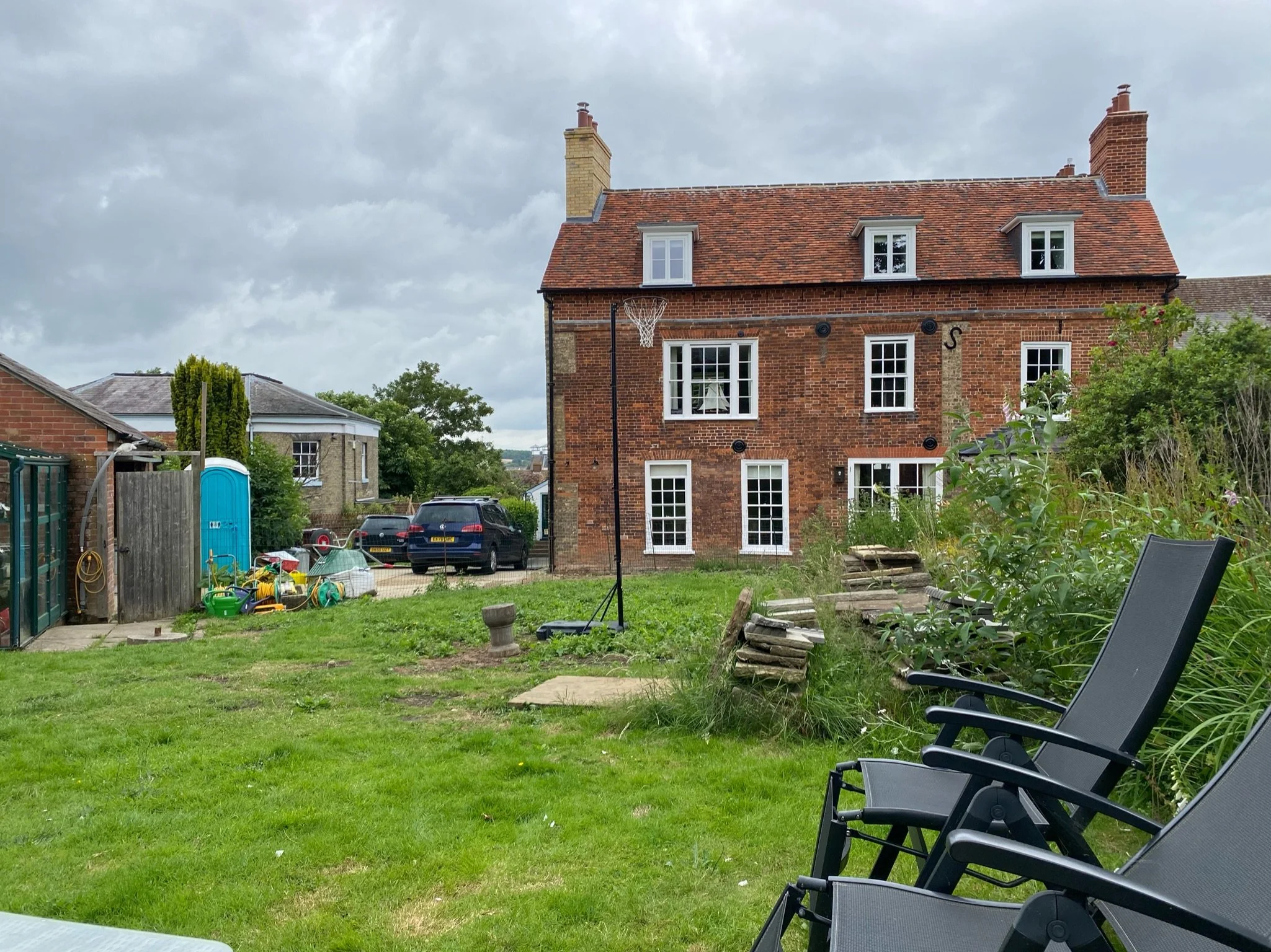 Up to the next lawn and at very top of the garden there is a smaller brick terrace from which there are is a delightful view across the rooftops of the town. Made from brick in a basketweave pattern and backed by a neat yew hedge this terrace is the perfect place to relax and enjoy a glass of wine on a summer’s evening whilst looking back down the garden towards the house.